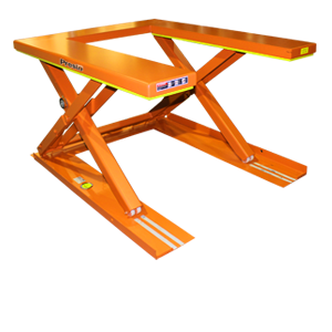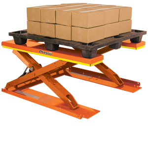 The U-Lift Roll-In Lift Table has been designed for feeding and offloading with an ordinary hand pallet truck. With a pallet truck in the fully raised position, the load can be placed on the lift. The pallet rides over the outside platform beams while the pallet truck fits in between them.